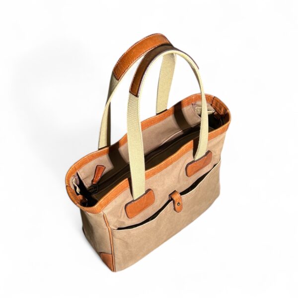 Chất liệu canvas thoáng khí, có kháng nước nhẹ, kết hợp da thật, nhiều ngăn khá hay ho, miệng túi có khóa kéo miệng, fit laptop 14″, giấy tờ A4,…